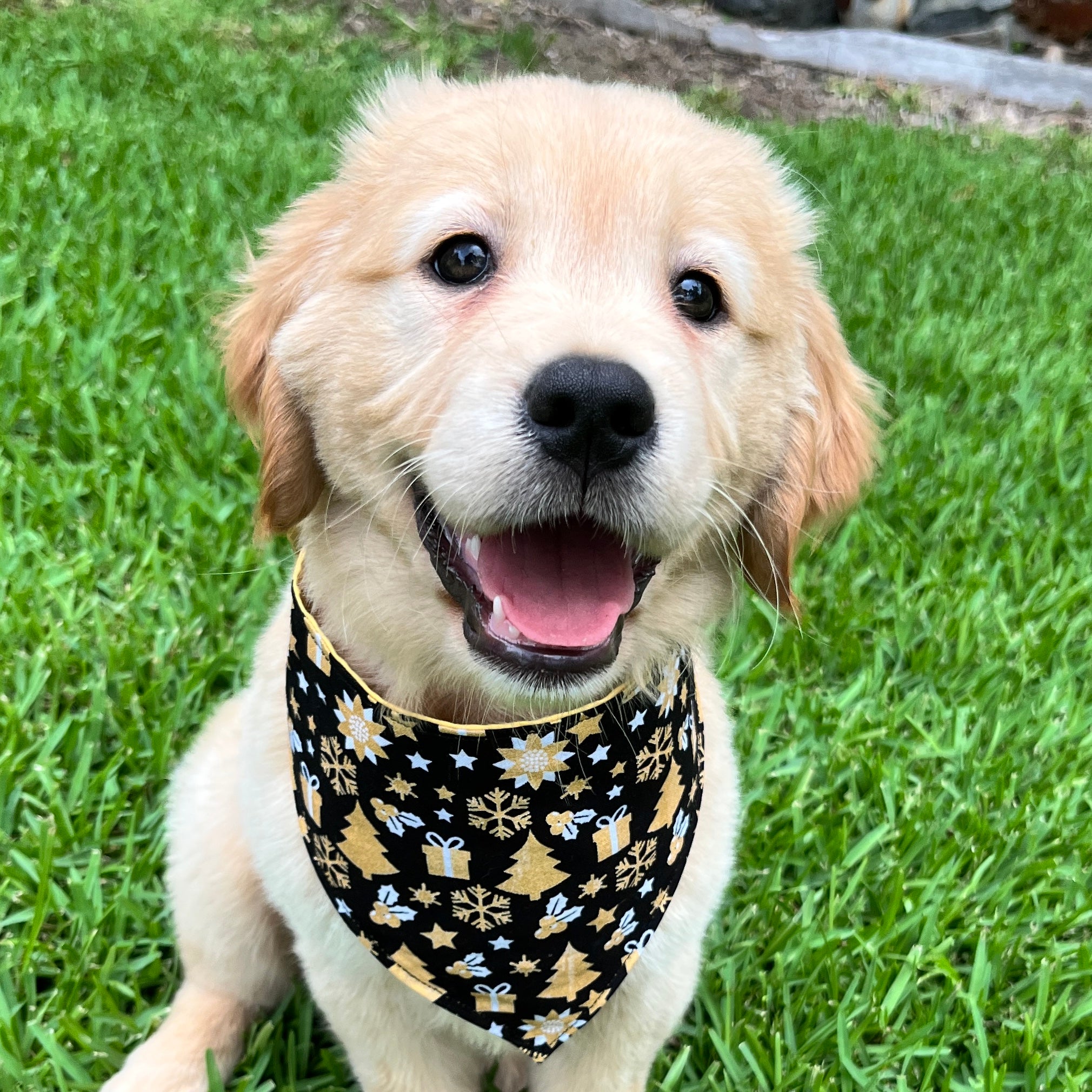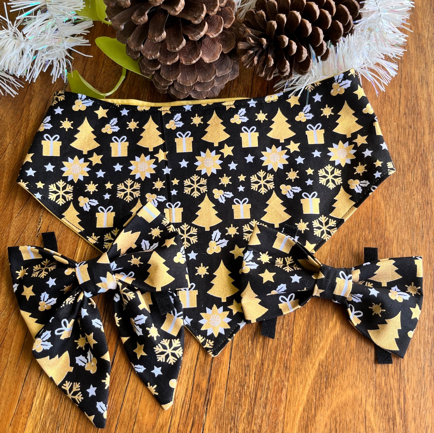 Choose from a Dog Bandana, Sailor Bow, or Bow Tie in this striking black and shimmery gold printed festive fabric - or a mix of them all!