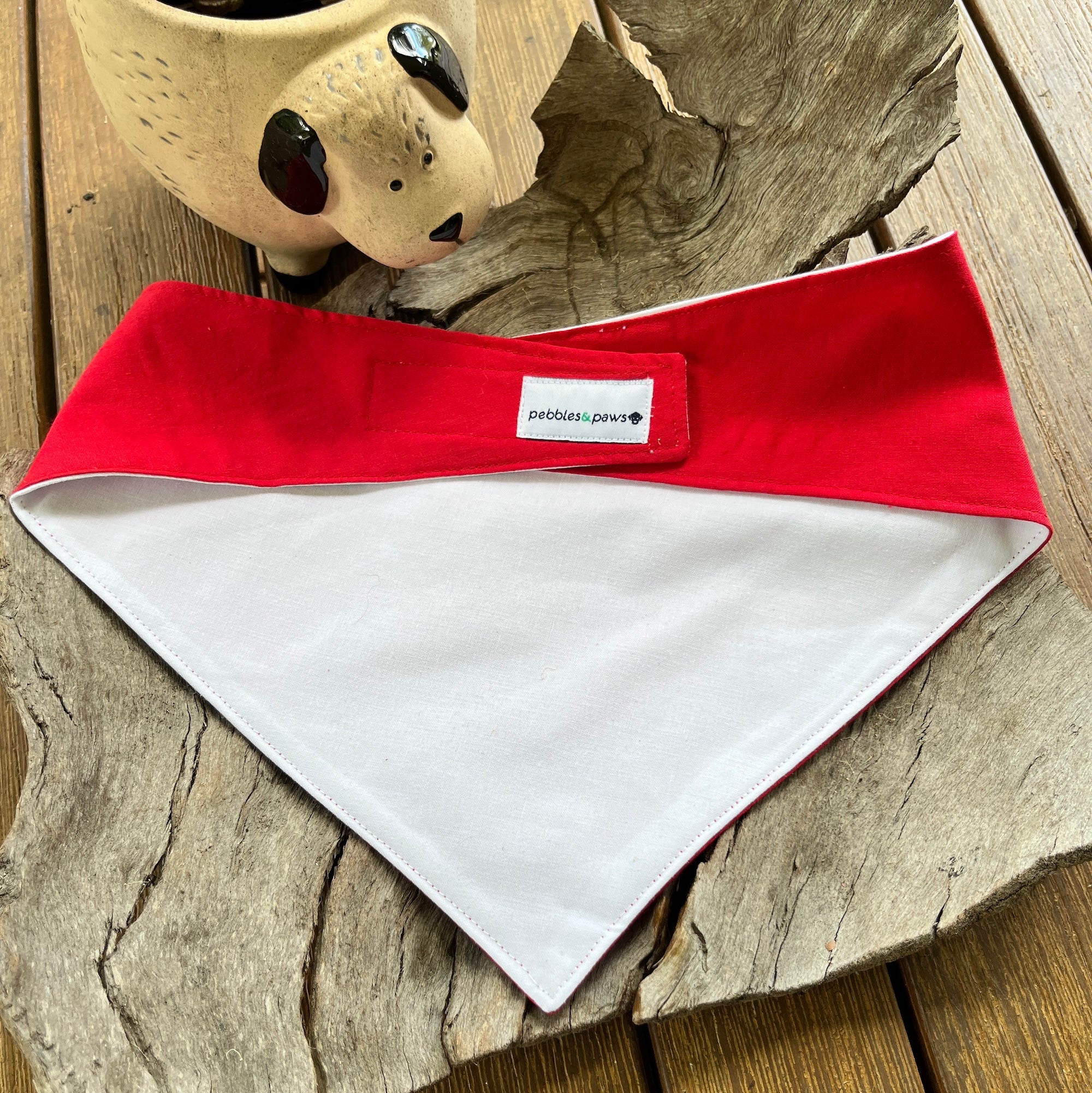There are two standard sizes to choose from (but other sizes can be created on request) and we have chosen Red with White print for a Valentines Day option - But we have a huge choice of colours for both fabric and print so if you have a specific colour combo in mind please drop me an email to deb@pebblesandpaws.com.au to enquire about availability, or to request smaller/larger sizes.