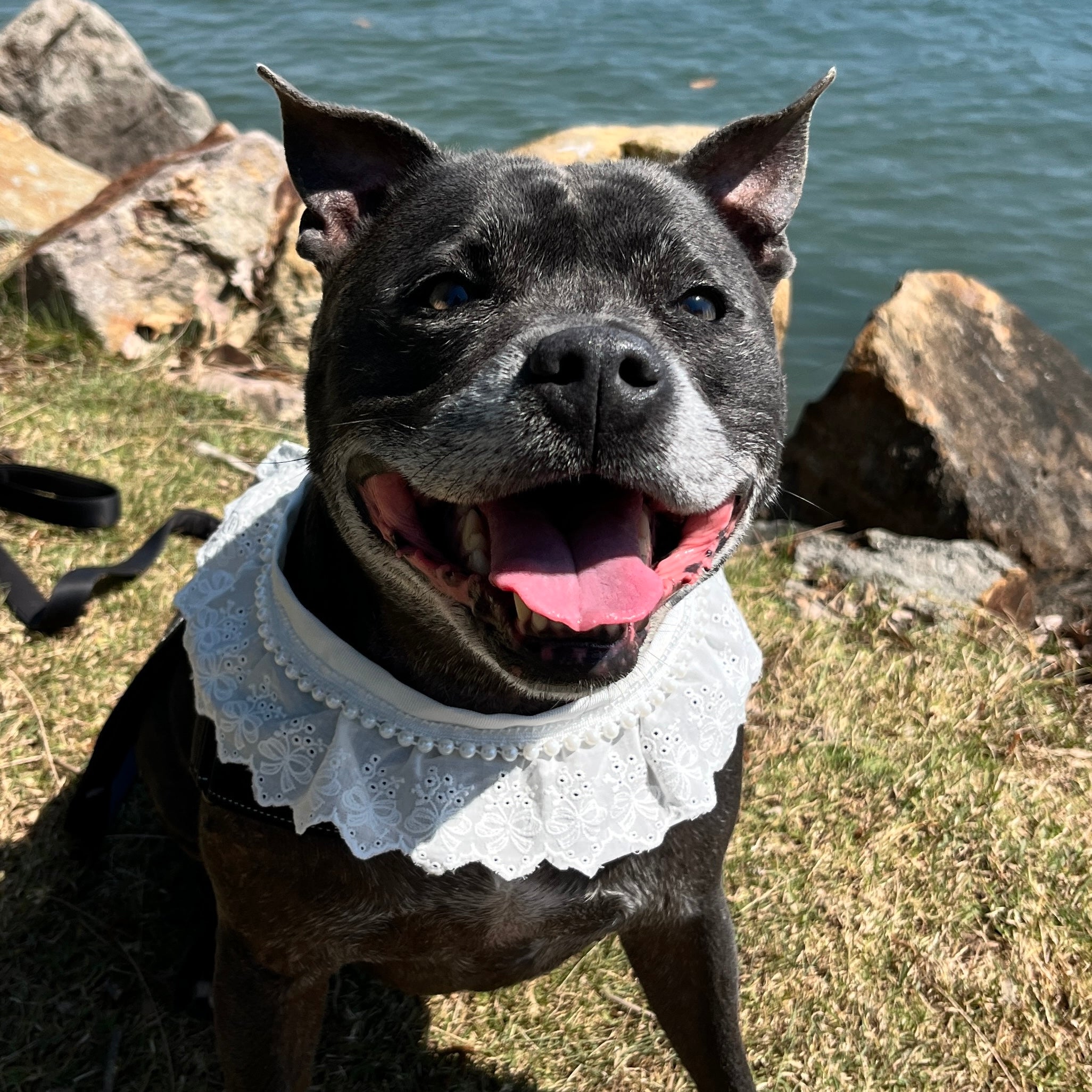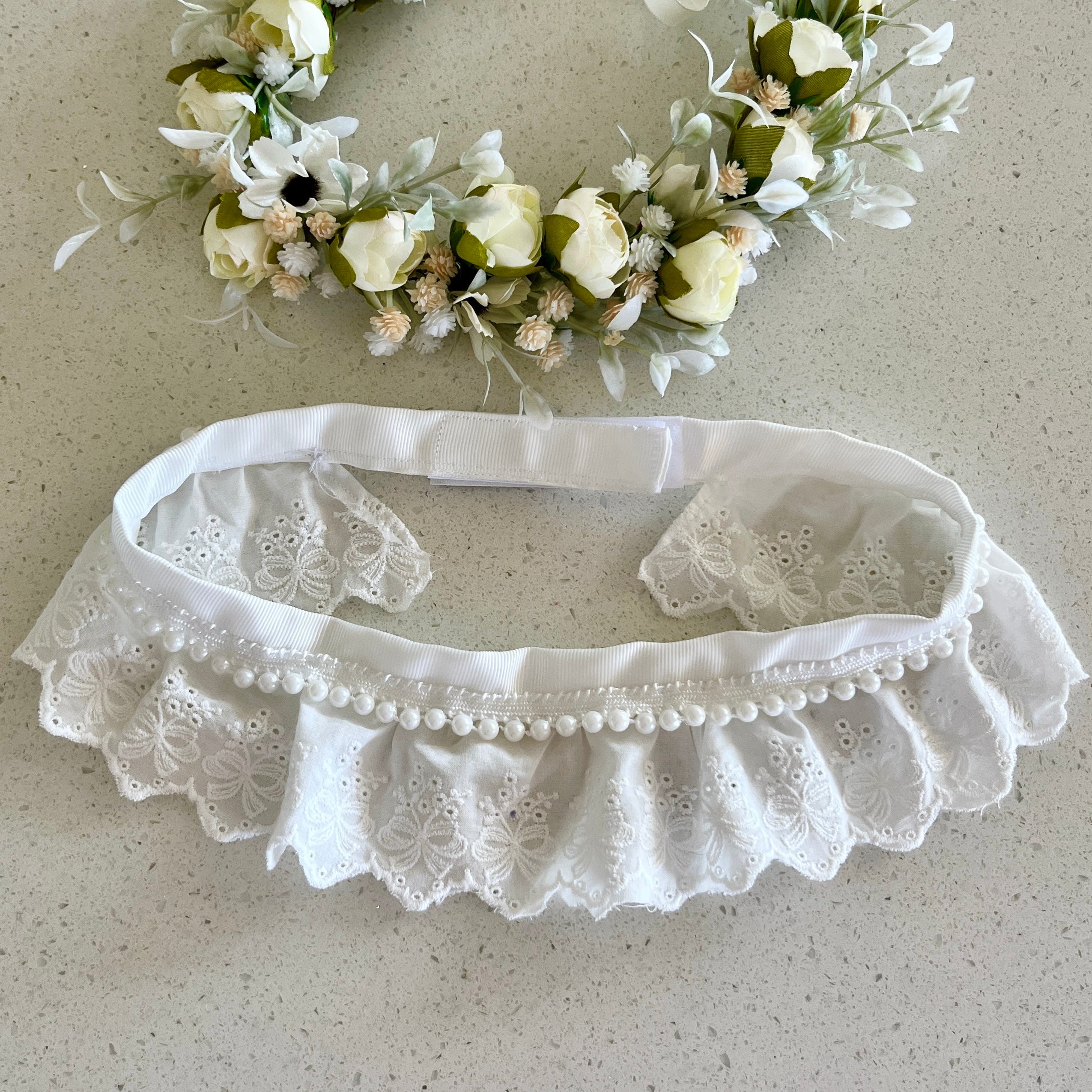 This pretty broderie anglaise collar with pretty bead trim is perfect for all those pups taking part in their pawrents' wedding day, or other special occasions. It has a length of hook and loop VelcroTM style style fixing to the back to adjust the fit, and looks stunning on all breeds and sizes