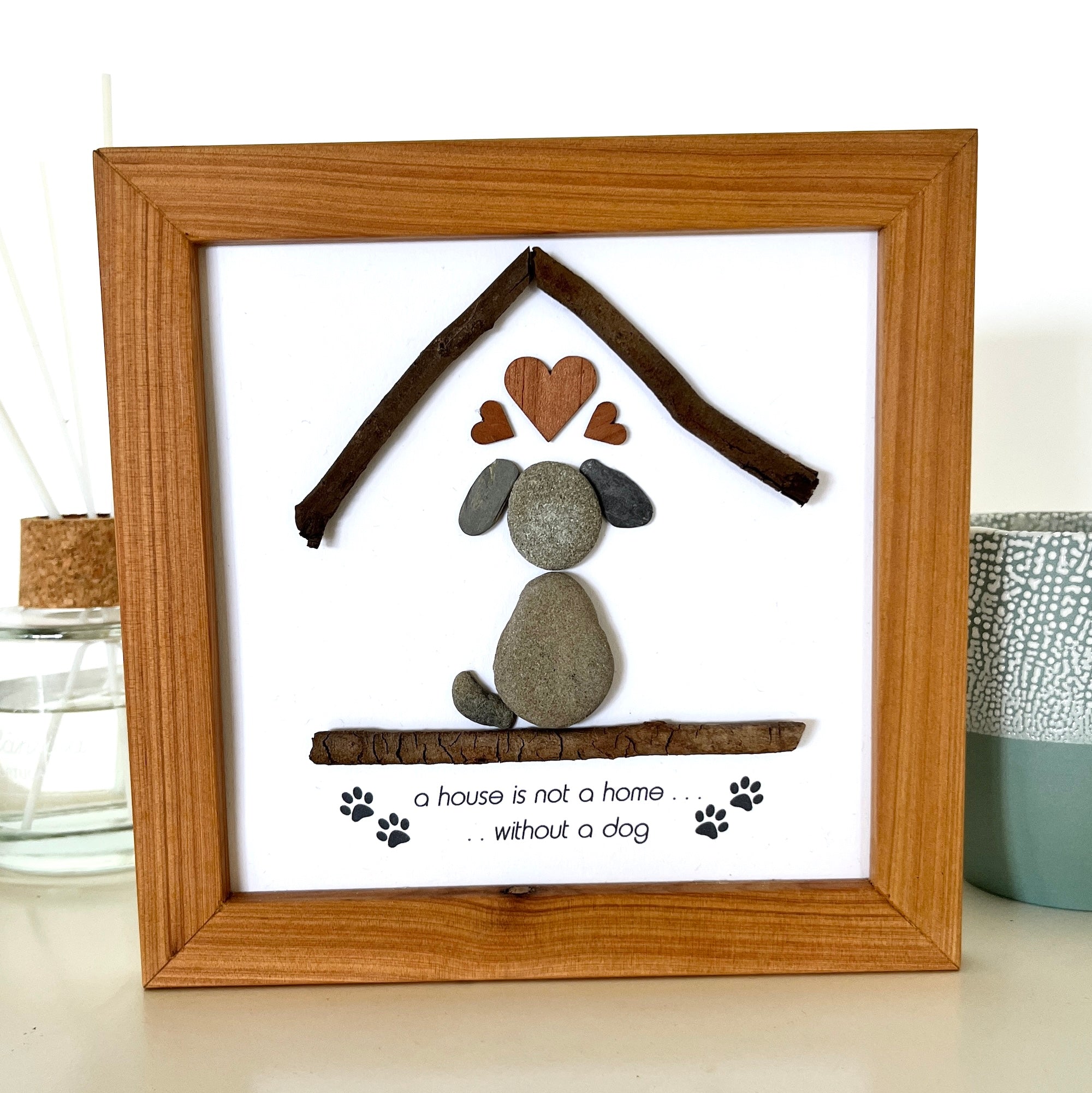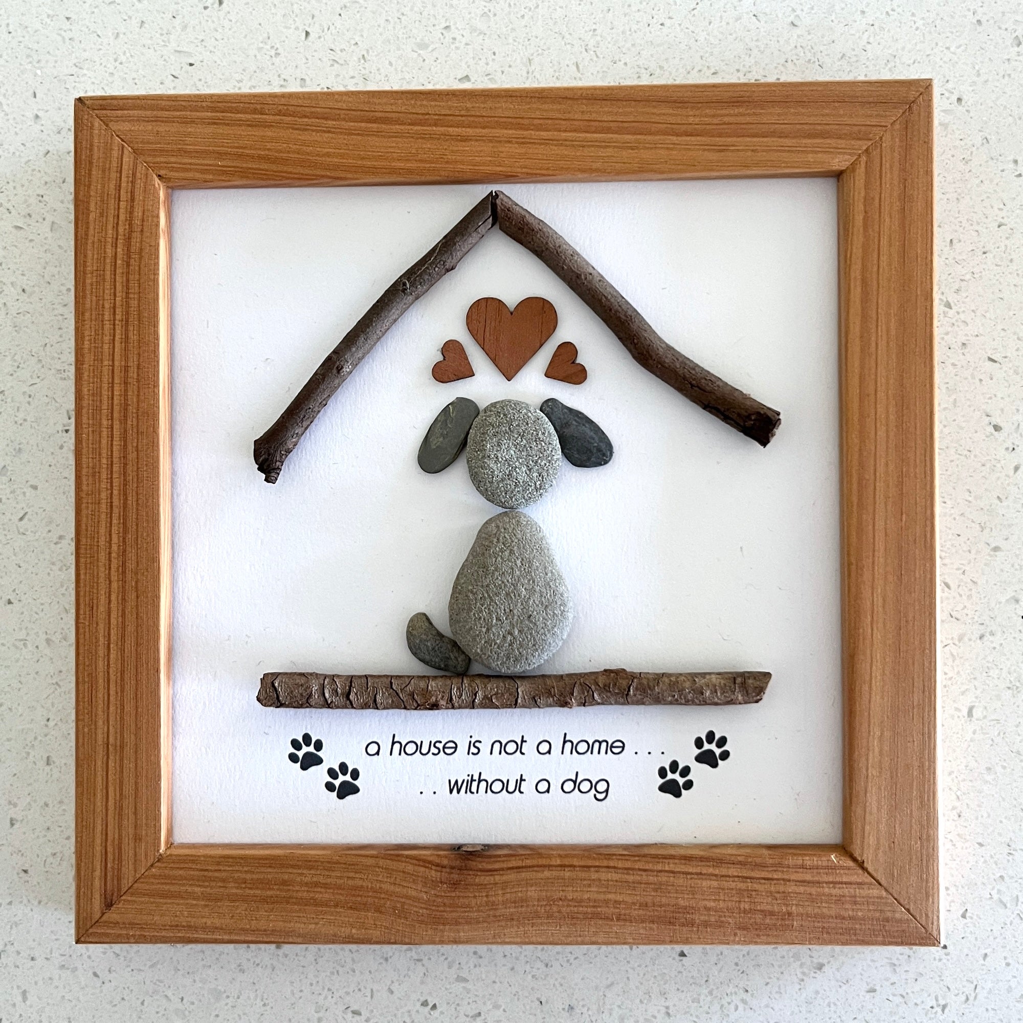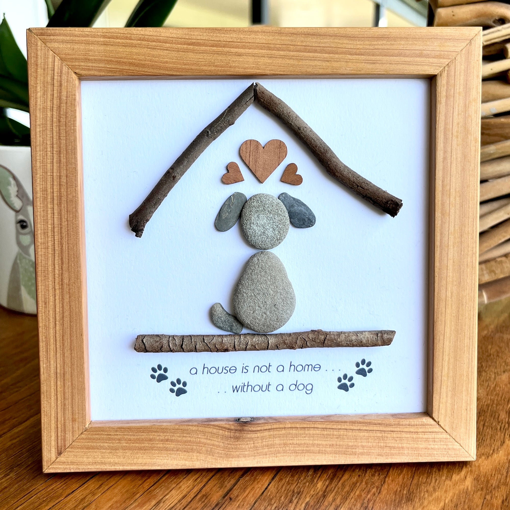 These simple yet beautiful designs combine a mix of pebbles sourced from local beaches here in Queensland - Choose from a design with one dog or two, each is supplied on white card, set within a handmade camphor laurel frame, which features a sawtooth bar on the reverse for hanging.