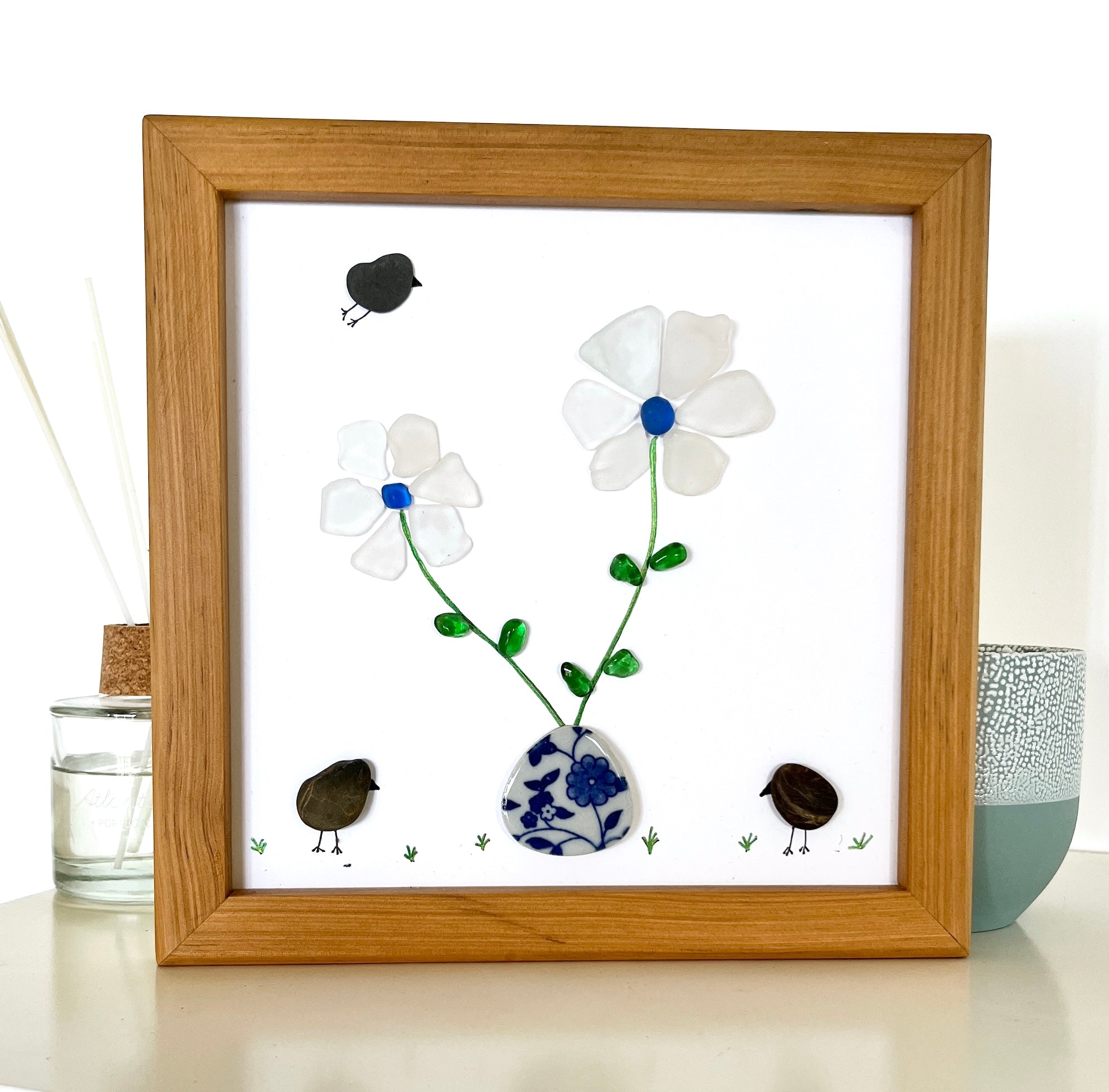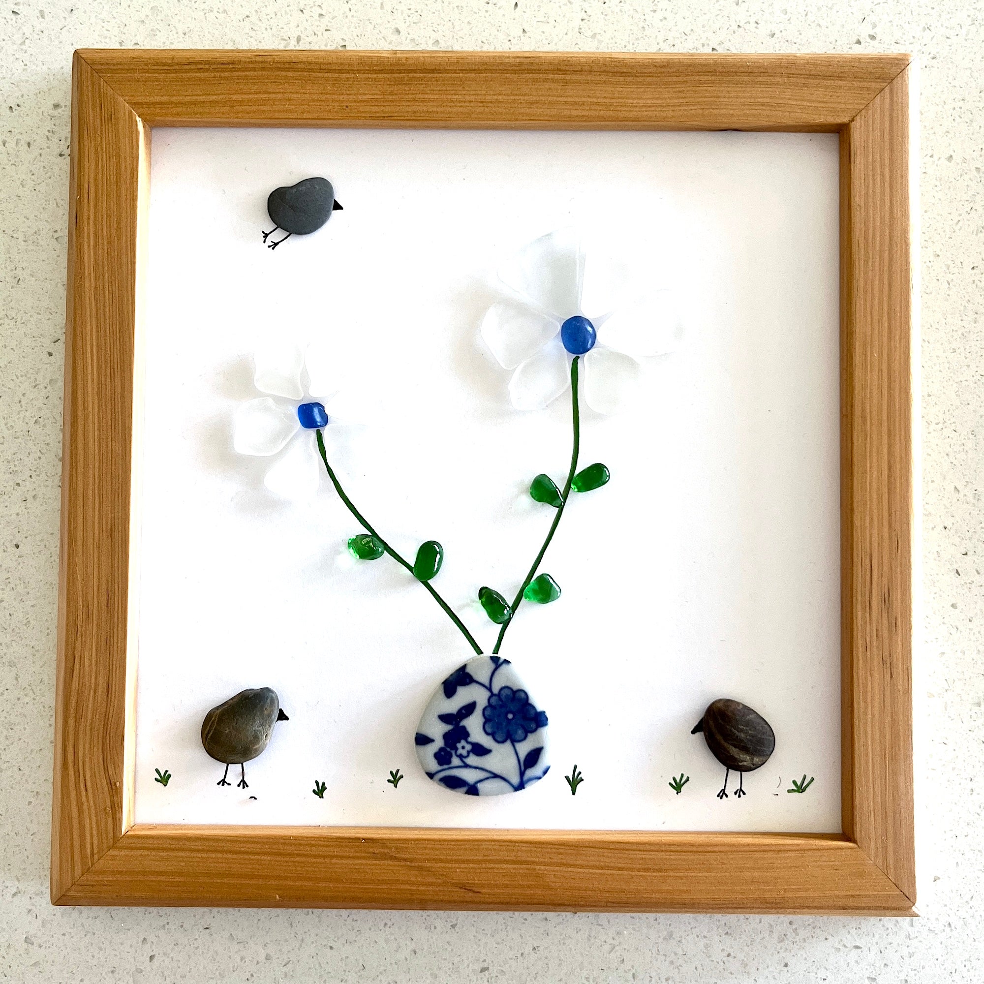 Square Framed Pebble and Sea Glass Art - Flowers in Ceramic Vase with Birds