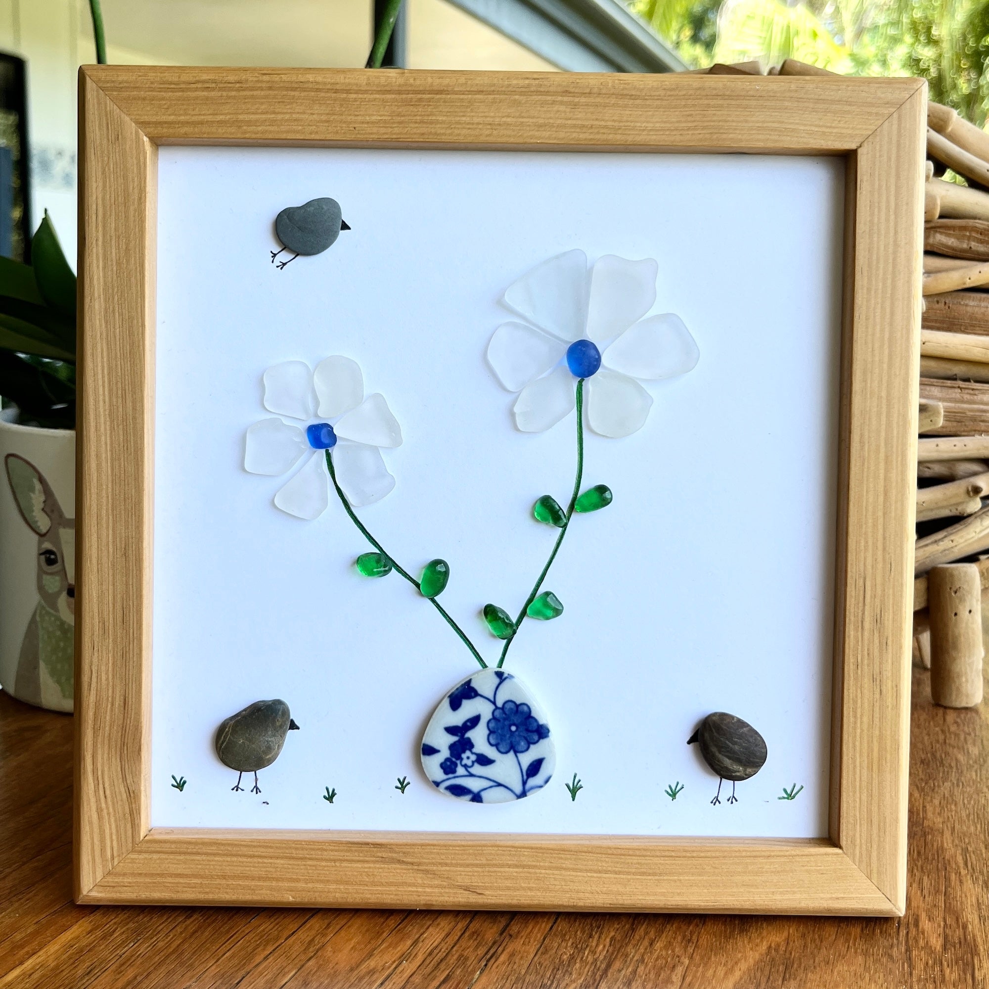 This simple yet beautiful design presents a couple of flowers made with a mix white and coloured sea glass pieces, set in a ceramic tile vase. Little Pebble birds complete the setting.  The flower art is set within a handmade Australian Cypress wooden frame, and there is a sawtooth bar on the reverse for hanging