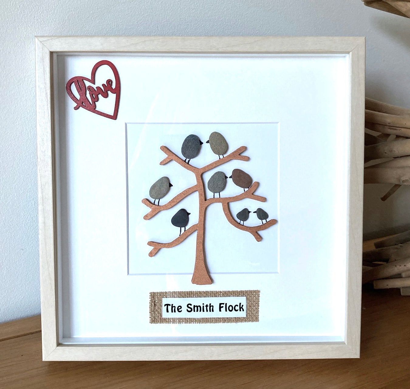 I was asked to create a unique pebble art picture that would represent several generations of one family, including a husband and wife, and their 3 children, one of whom had married and had two children. To accommodate this I created a bespoke plywood tree, and the resulting family of pebble birds - the "Family" Flock