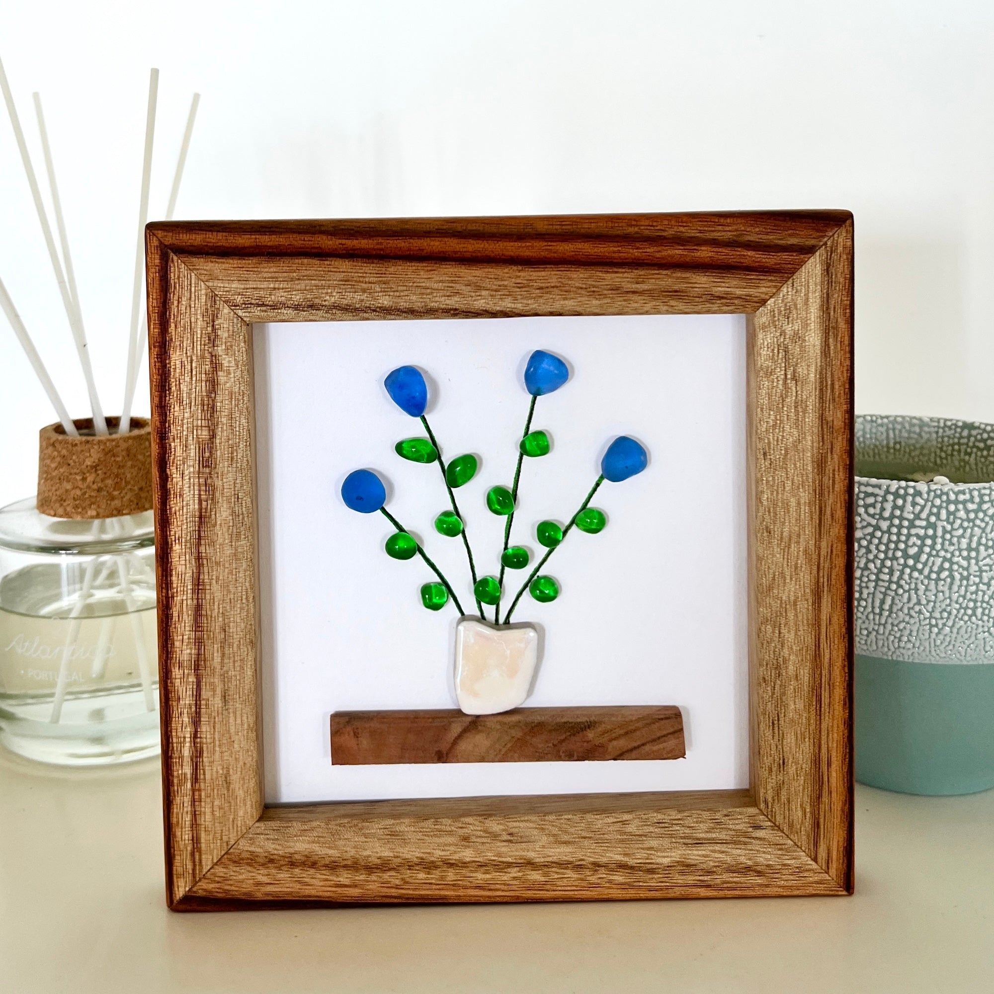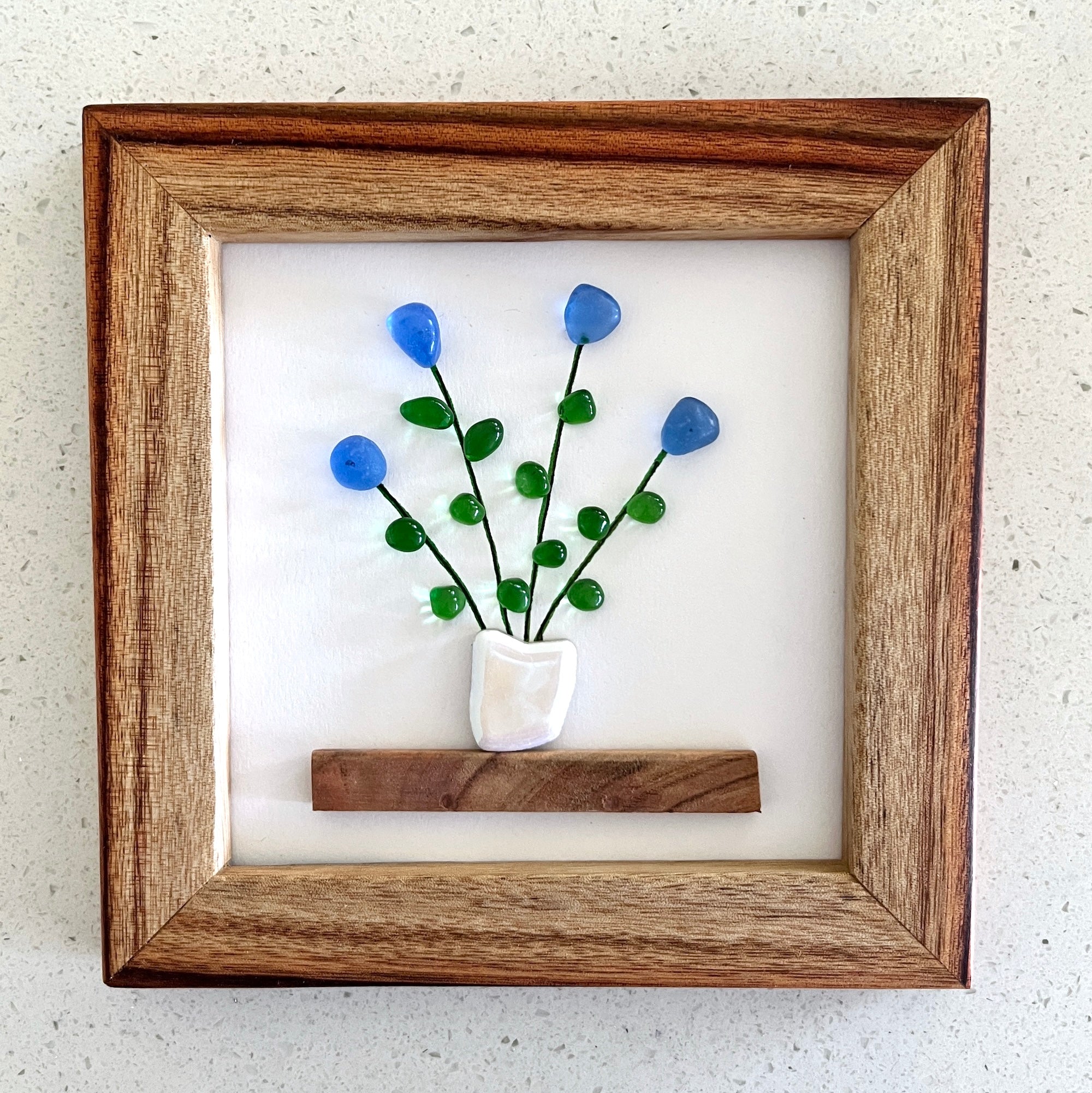 This simple yet striking design features a number of pretty blue sea glass flowers on stems with green sea glass leaves. The flower bunch "sits" in an iridised white tile planter on a shelf that matches the frame