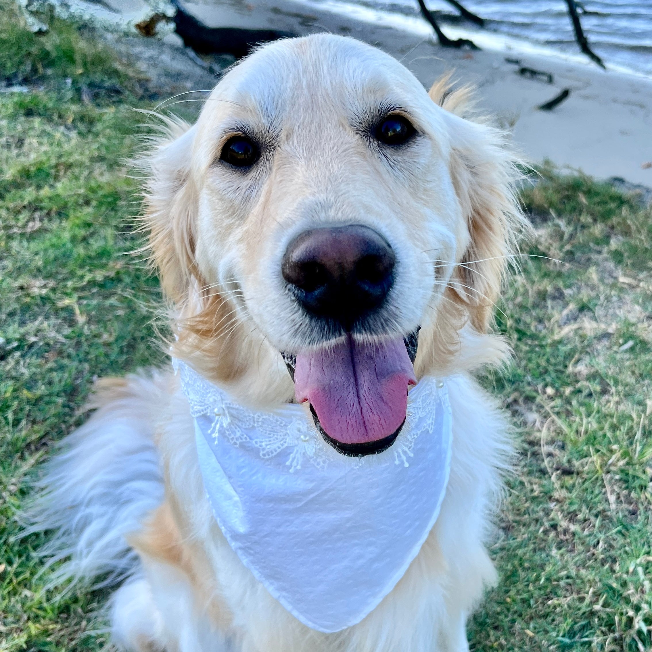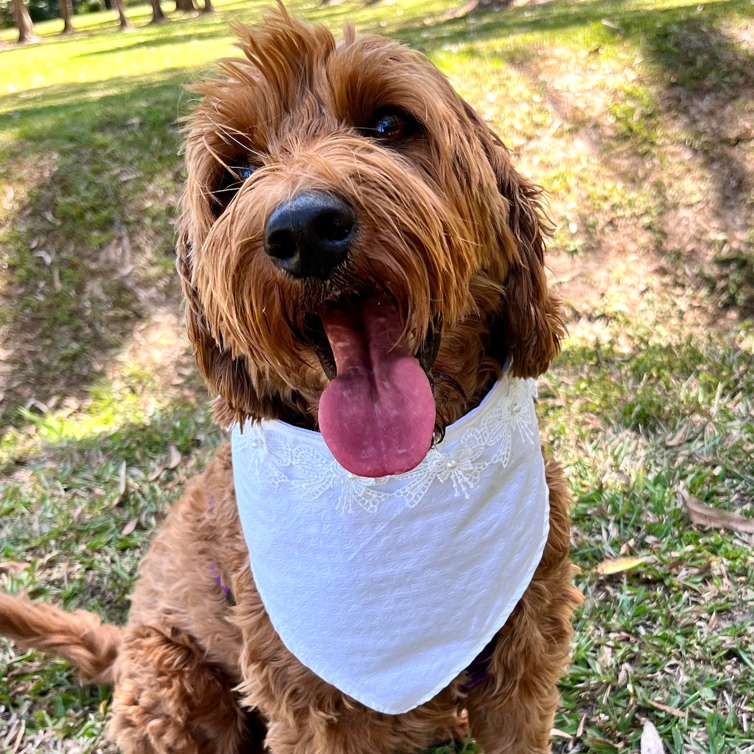 Practical, pretty, and hand washable. Soft satiny fabric with full cotton lining. Also if you would like a custom made bandana featuring a specific fabric or colour to co-ordinate with your wedding please message me deb@pebblesandpaws.com.au as I am always happy to see if I can work with you to accommodate special requests