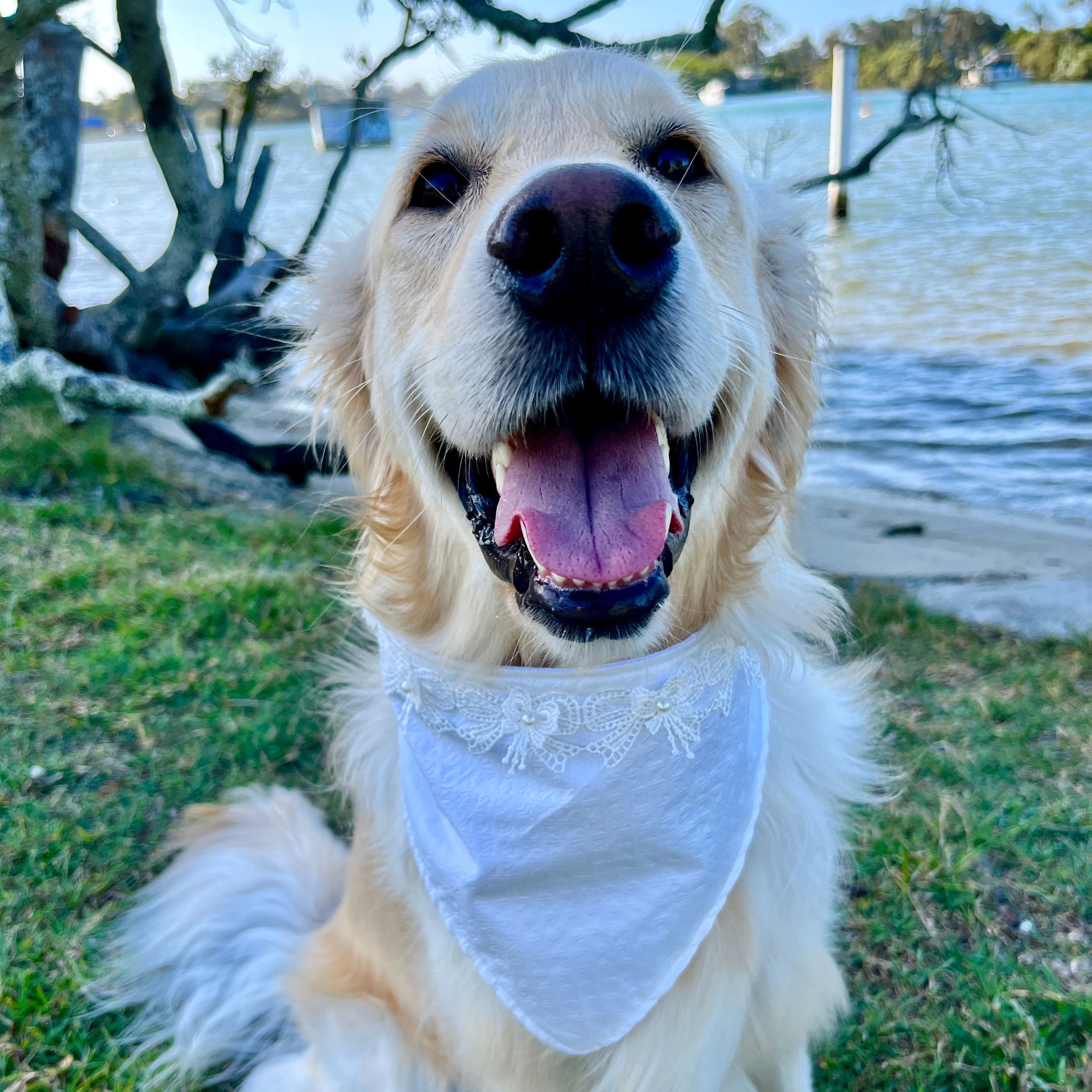 This pretty satin style embossed fabric Bandana with pretty lace trim is perfect for all those pups taking part in their pawrents' wedding day, or other special occasions. It has a length of hook and loop VelcroTM style style fixing to adjust the fit, and it can be worn down the chest of your dog, or for maximum exposure turned around to show on their back.